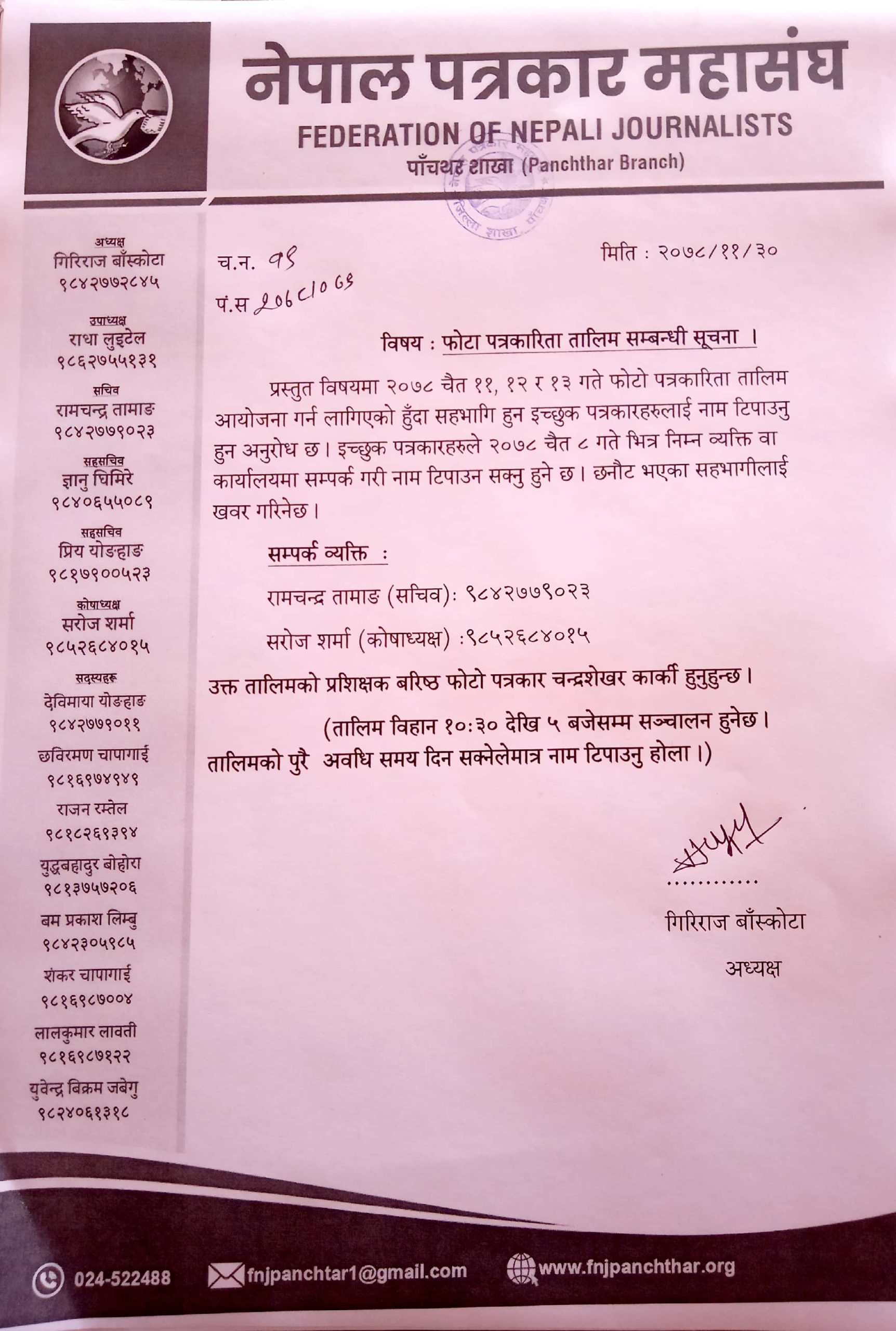 प्रस्तुत विषयमा २०७८ चैत ११, १२ र १३ गते फोटो पत्रकारिता तालिम आयोजना गर्न लागिएको हुँदा सहभागि हुन इच्छुक पत्रकारहरुलाई नाम टिपाउनु हुन अनुरोध छ । इच्छुक पत्रकारहरुले २०७८ चैत ८ गते भित्र निम्न व्यक्ति वा कार्यालयमा सम्पर्क गरी नाम टिपाउन सक्नु हुने छ । छनौट भएका सहभागीलाई खवर गरिनेछ ।